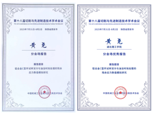 7月31日—8月2日,776net必赢官网青年教师黄尧赴陕西西安参加第十八届切削与先进制造技术学术会议,凭借其在先进制造工艺优化及多物理场耦合数值模拟领域的创新性研究成果,荣获“分会场优秀报告”,充分展现了学院在相关学科领域的科研实力与学术影响力。